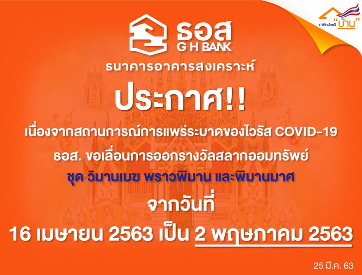 ในขณะที่ธนาคารอาคารสงเคราะห์ ธอส ก็มีมติพิจารณา เห็นสมควรให้เลื่อนการออกรางวัลสลากออมทรัพย์ของธนาคารทั้ง 3 ชุด งวดประจำวันที่ 16 เมษายน 2563 ออกไปเป็นวันที่ 2 พฤษภาคม 2563 ประกอบด้วย ชุดวิมานเมฆ หน่วยละ 1 ล้านบาท